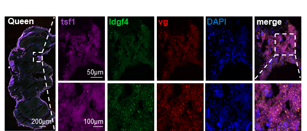 蜜蜂(Apis mellifera)是常见的社会性昆虫之一。在蜂群中,工蜂和蜂王均由二倍体受精卵发育而来,二者基因组高度相似。然而,这两种雌性级型在形态、生理、行为、寿命等方面存在巨大差异。蜂王主要负责繁殖以及通过分泌信息素来维持蜂群的稳定。工蜂则承担了除生育以外的绝大多数工作,并且它们的职责通常随着年龄增长而改变,例如刚出房的工蜂在巢内从事哺育幼虫的工作,而年老的工蜂在巢外采集食物。雌性蜜蜂的级型分化和劳动分工现象是蜜蜂生物学的经典问题之一,关于这些现象的调控机制目前仍知之甚少。