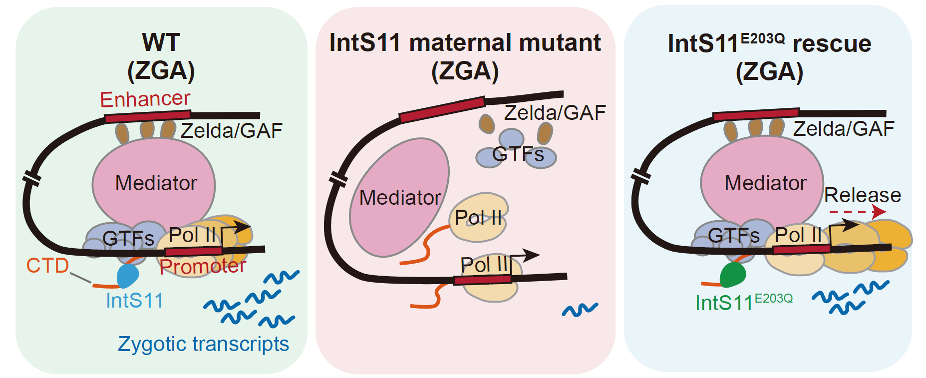 研究团队利用JabbaTrap系统,在果蝇早期胚胎中实现了对核内母源IntS11蛋白的特异性清除。结果显示,IntS11母源缺失会导致全基因组范围内的ZGA程序无法正常启动,并引起胚胎完全致死;同时,先驱转录因子Zelda和GAF在早期胚胎染色质上的结合显著减少。进一步的机制研究发现,IntS11通过促进RNA聚合酶II(Pol II)在启动子区域的初始招募,驱动包括Mediator复合物和通用转录因子在内的转录前起始复合物(PIC)从头组装。这一过程为先驱转录因子Zelda和GAF的稳定结合提供了必要条件,并协同促进增强子-启动子(E-P)及启动子-启动子(P-P)的空间互作,从而推动早期转录调控中心的形成。功能解析进一步揭示IntS11在ZGA过程中具有双重调控效应,遗传挽救实验表明缺失内切酶活性的IntS11突变体蛋白仍能够部分恢复早期胚胎中Pol II的招募及转录机器的组装,说明这一过程并不依赖其经典的RNA内切酶活性;而其内切酶活性则主要参与后续的转录延伸与终止过程。该发现突破了以往对整合子复合体主要参与转录近端或远端终止的传统认识,揭示了其在转录起始阶段同样具有关键且不可替代的结构性调控作用。